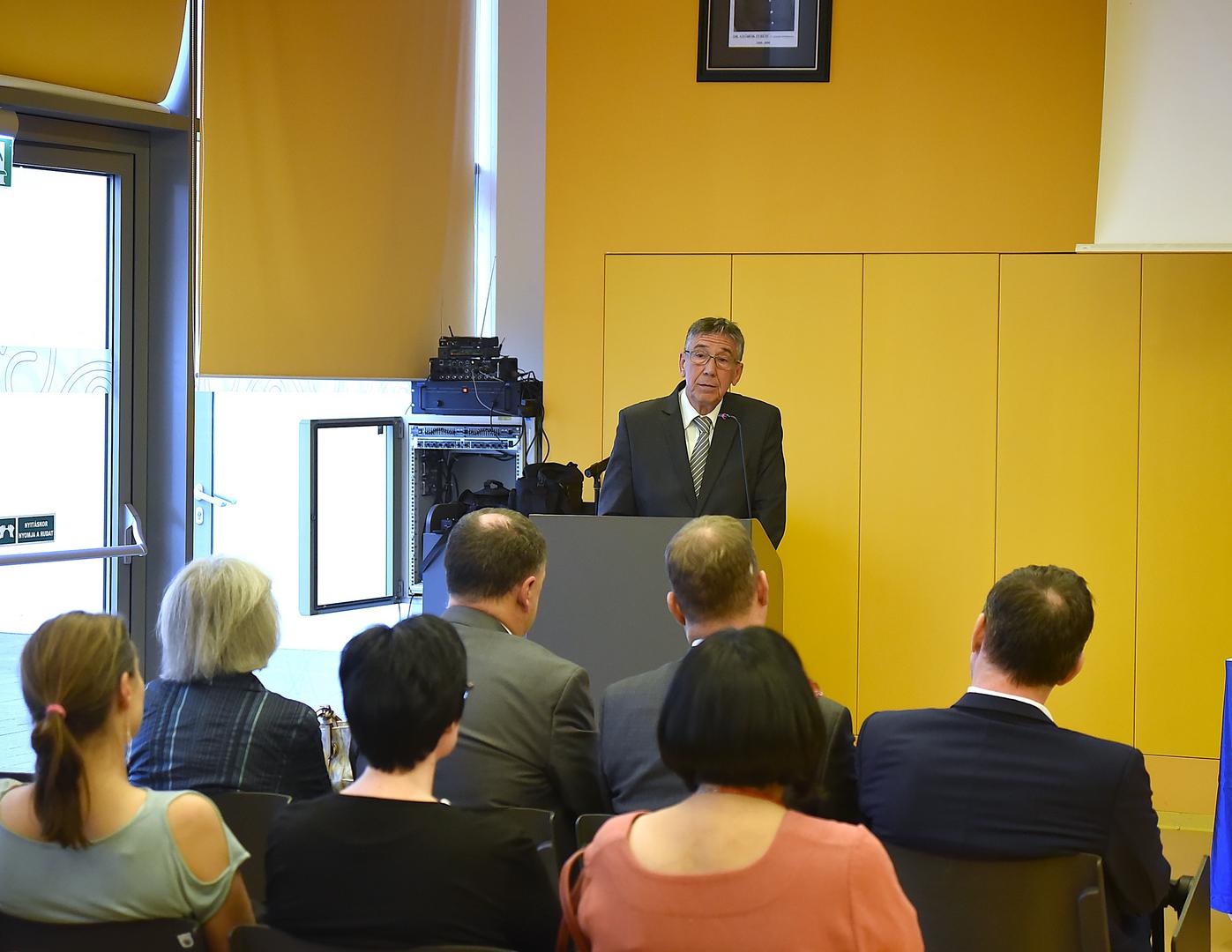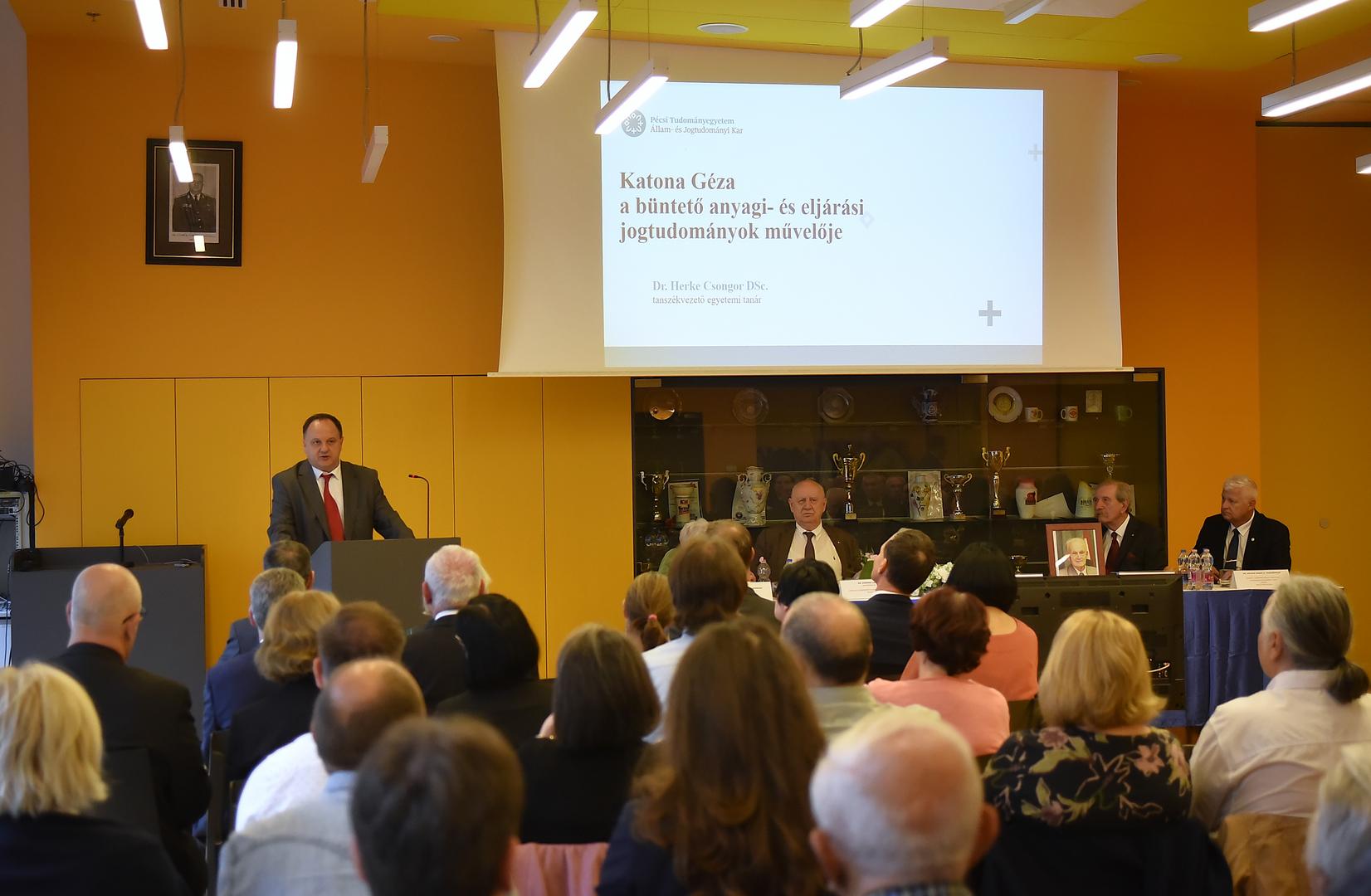 Herke Csongor, a Pécsi Tudományegyetem tanszékvezető egyetemi tanára Katona Géza életútját és publikációs tevékenységét elemezte, kiemelve a kriminalisztika és a büntetőeljárásjog szoros összefonódását. Beszédében hangsúlyozta, hogy Katona Géza nem csupán elismert tudós és tábornok volt, hanem hidat épített a büntető anyagi jog, a kriminalisztika és a kriminológia között. Elmondta, hogy a mai jogi gyakorlatban gyakran hiányzik a kriminalisztikai szemlélet, pedig ez elengedhetetlen a hatékony büntetőeljáráshoz. Érdekességként kiemelte, hogy Katona Géza a jogi diploma után beiratkozott a vegyipari technikumba, hogy speciális ismereteket szerezzen a kriminalisztikához, ami később nagy jelentőséggel bírt a büntető anyagi jog szempontjából. Herke Csongor külön kitért a bizonyítás elméletére, hangsúlyozva Katona Géza szerepét a közvetett bizonyításban és a szakértői véleményben. Idézte Katona Gézát, aki a bizonyítás történeti fejlődését elemezte, bemutatva, hogyan váltak a tárgyi bizonyítékok elsődlegessé a személyi bizonyítékokkal szemben a 19. század végétől, ugyanakkor figyelmeztetett a modern technológiák (pl. az MI-hamisítások) miatti visszarendeződésre, ahol ismét a személyi bizonyítékok nyerhetnek teret.
