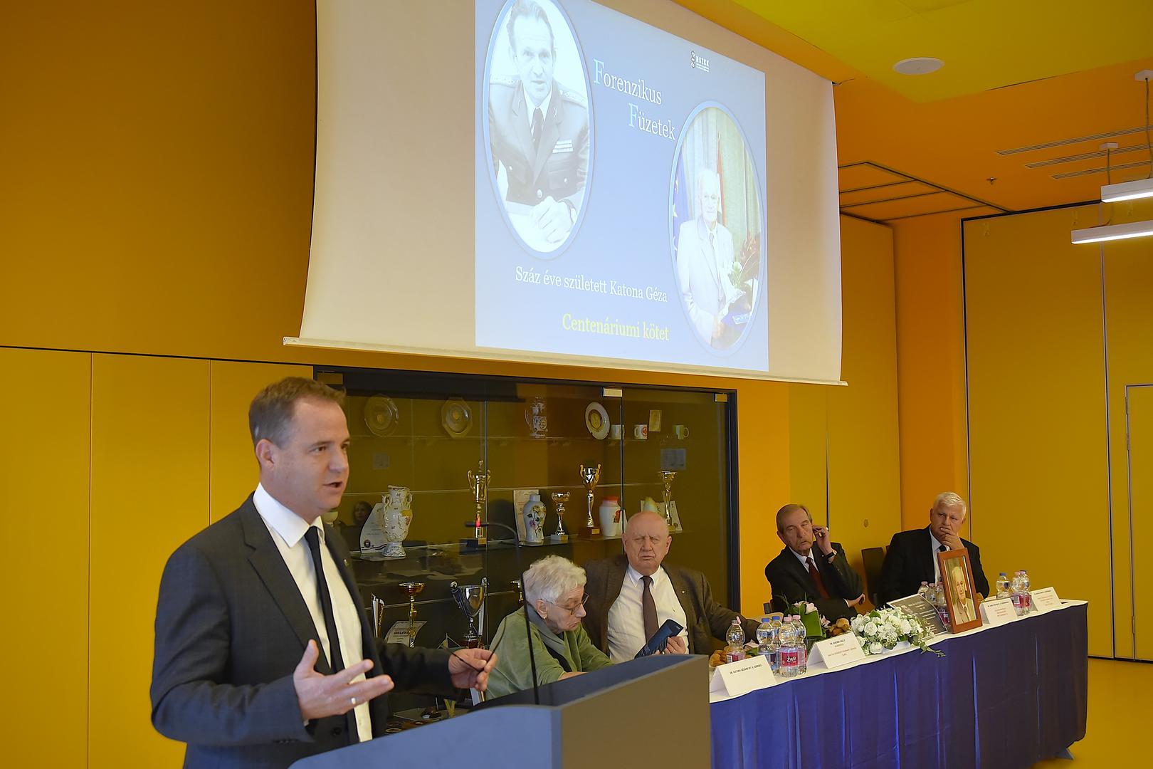 Lontai Márton, a Nemzeti Szakértői és Kutató Központ (NSZKK) főigazgatója mutatta be a 2024-ben indított Forenzikus Füzetek sorozatot, amelynek elsődleges célja az NSZKK-ban folyó igazságügyi szakértés eredményeinek tudományos, ismeretterjesztő jellegű közzététele. A sorozat a szakmai identitás erősítése és a tudás terjesztése mellett tiszteleg a szakma alapjait lefektető tudósok előtt, ezért is szentelték negyedik számát Katona Géza emlékének.