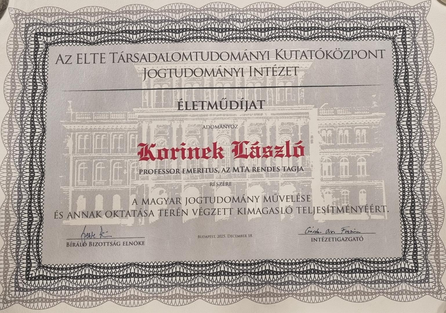 Az ELTE Társadalomtudományi Kutatóközpont Jogtudományi Intézet Prof. Dr. Korinek László úrnak, az MRTT elnökének a magyar jogtudomány művelése és annak oktatása terén végzett kimagasló teljesítményért életműdíjat adományozott.